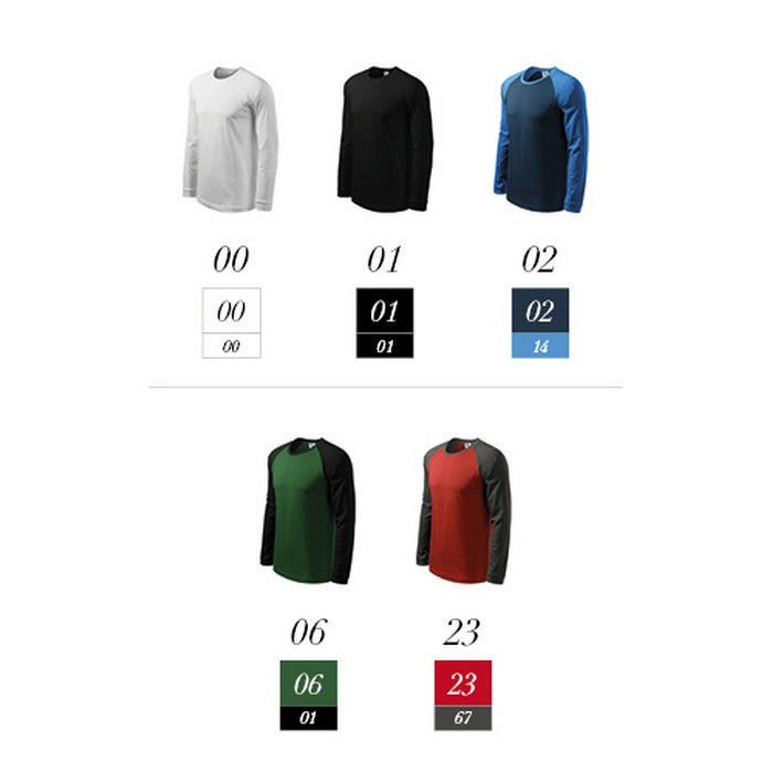 Tricou cu maneca lunga din material: 180 g/mp, Single Jersey, 100 % bumbac. Marimi M - 2XL. Model format din doua culori (cu exceptia culorilor 00, 01), cusaturi laterale, tivul ingust al gulerului este confectionat din material raiat 1:1, cu adaos de 5 % elastan, interiorul gulerului prezinta banda de intarire din acelasi material de baza, maneci lungi de tip raglan cu mansete, mansetele sunt confectionate din material raiat 1:1, cu adaos de 5 % elastan.