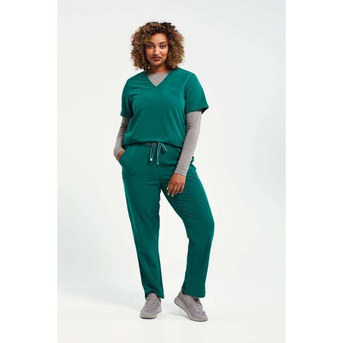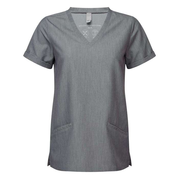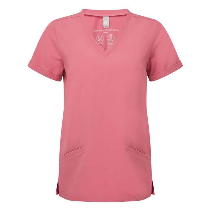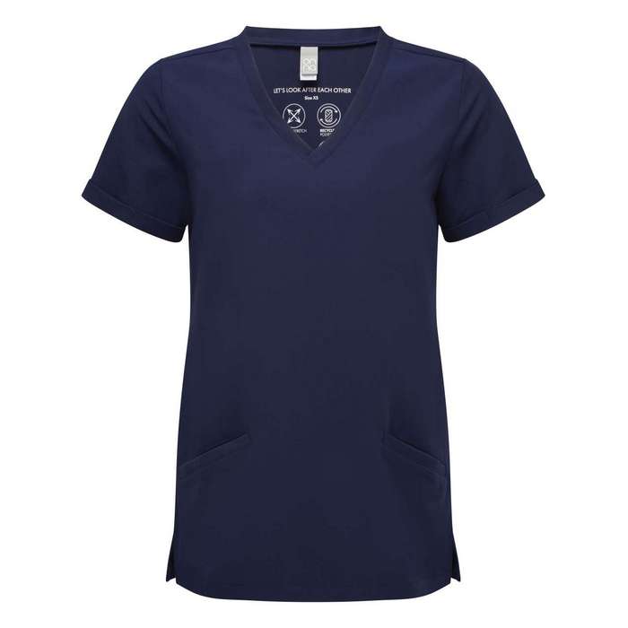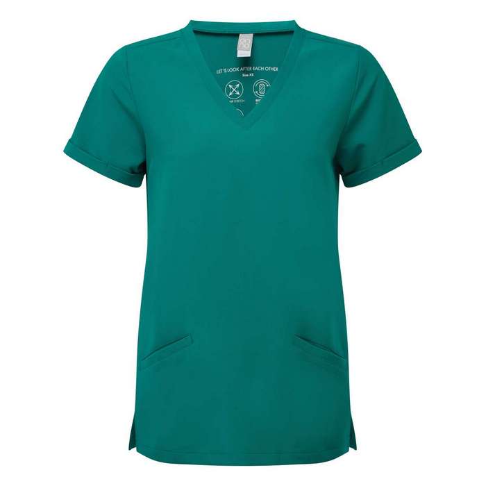 Bluza profesionala de dama pentru sectorul medical, cosmetic, farmaceutic, din material 210 g/mp 42% poliester, 33% poliester reciclat, 19% vascoza, 6% elastan, respirabila, elastica in patru directii pentru miscare usoara si confort pe tot parcursul zilei, durabila, rezistenta la sifonare si usor de intretinut, decolteu in V, cu două buzunare frontale, croiala moderna cu pense la spate si orificii laterale, marimi: XS -3XL, maneca scurta