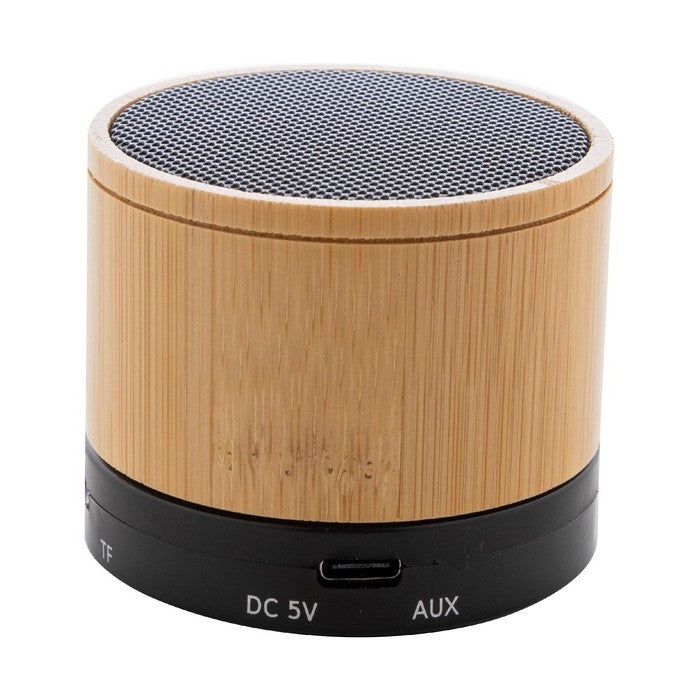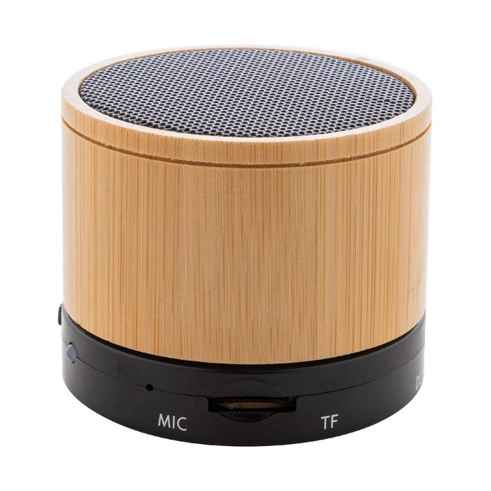 Boxa wireless din ABS reciclat si carcasa de bambus, cu plasa metalica si baterie reincarcabila (300 mAh). cu functii de apelare hands-free si redare MP3 cu card micro SD. Include cablu de incarcare USB., material: ABS reciclat+lemn, dimensiune: ø60×50 mm