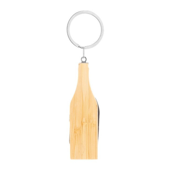 Breloc multifunctional, in forma de sticla, din otel inoxidabil si bambus. cu 4 functii: cutit, tirbuson, Desfacator de sticle si pila., material: lemn+bambus, dimensiune: 20×75×10 mm