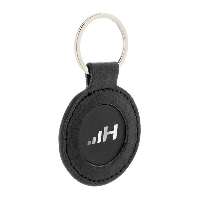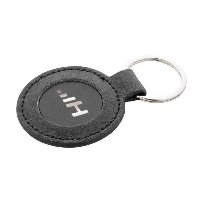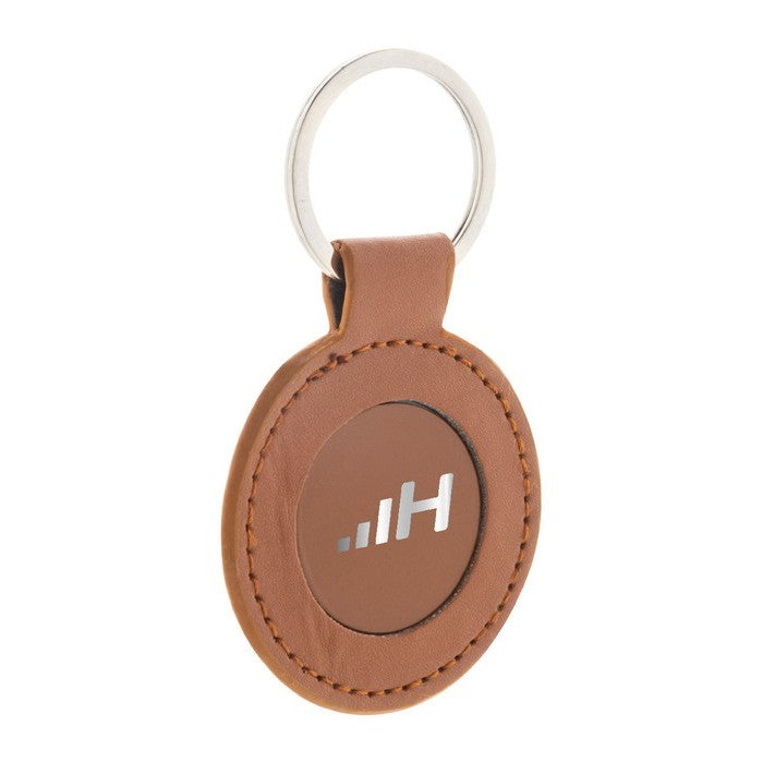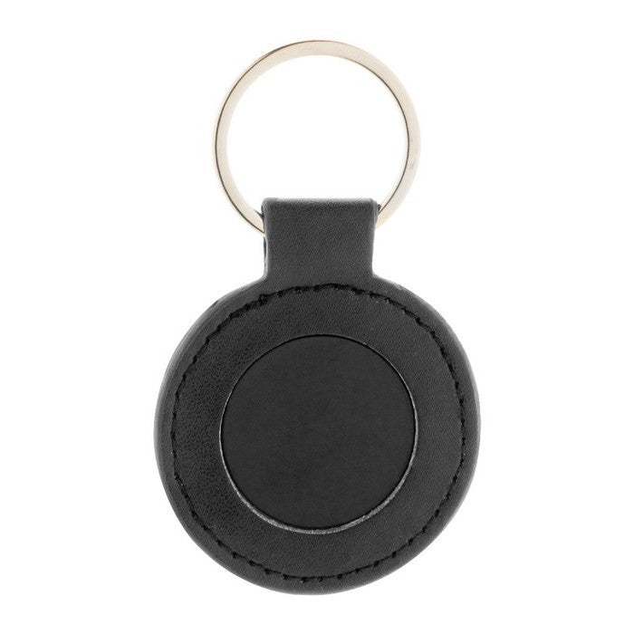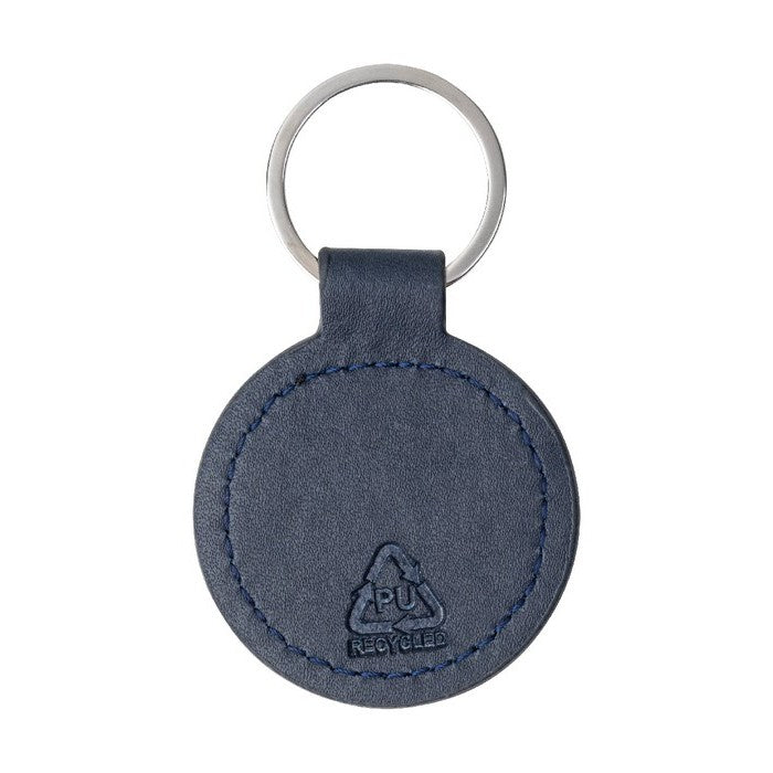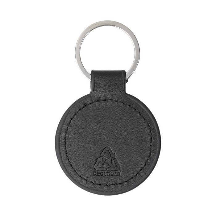 Breloc rotund, din piele PU reciclata, cu inel metalic si placa cu logo din otel inoxidabil cu finisaj cauciucat. cu acoperire speciala pentru gravare cu laser in oglinda., material: imitatie de piele reciclata+lemn, dimensiune: ø50×2 mm