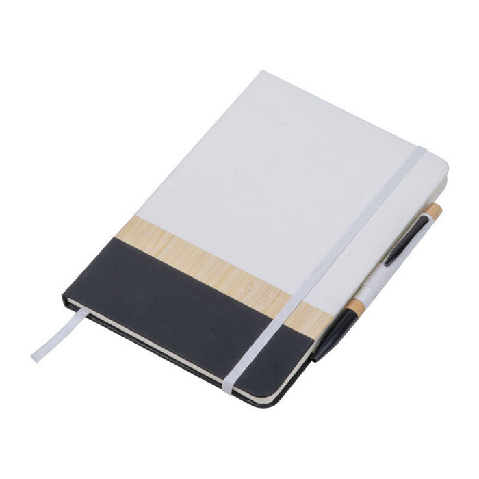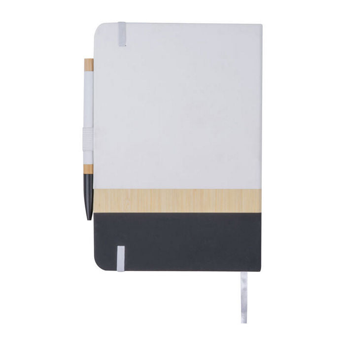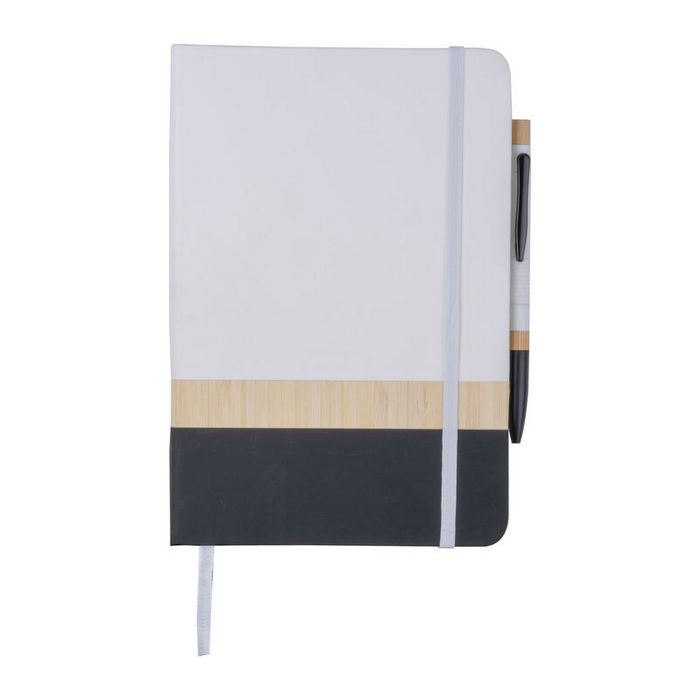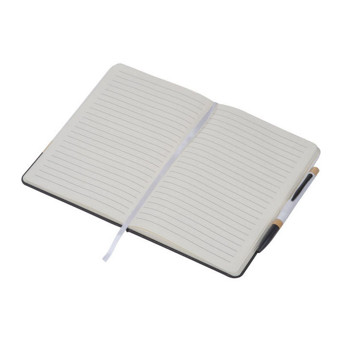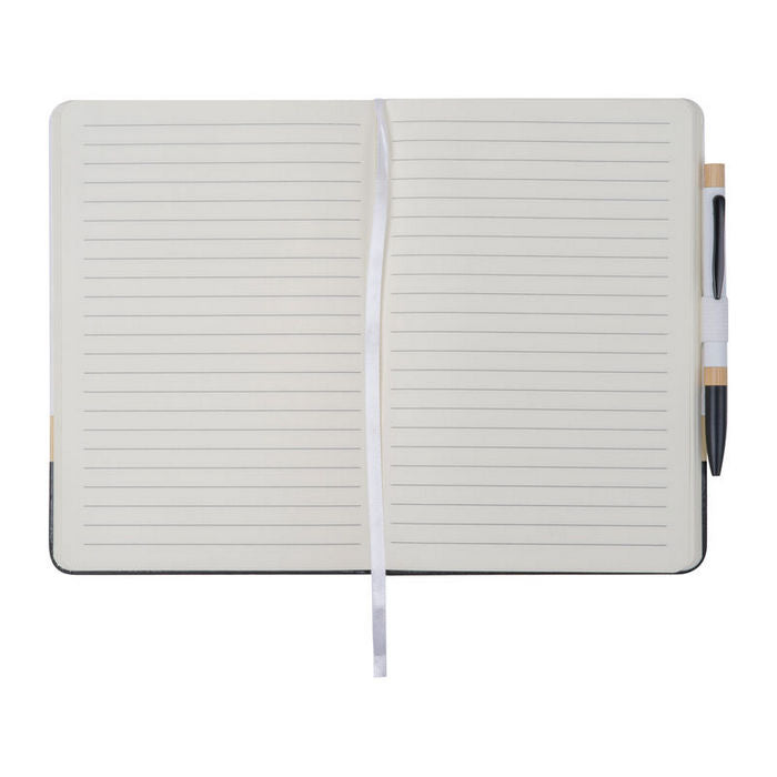Bloc notes A5 cu pix. Caietul este realizat din hartie reciclata (160 de pagini liniate), coperta din bambus si PU. Pixul asortat este fabricat din aluminiu si bambus. , dimensiune: 14,5 x 1,5 x 21 cm
