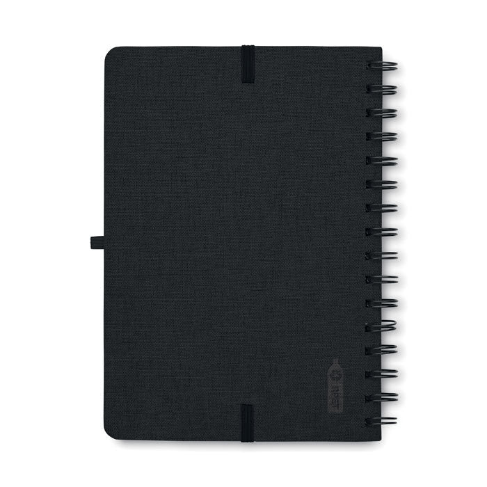 , Notebook A5 cu coperta tare 600D RPET cu functie de suport pentru smartphone. Cu doua spire. 160 de pagini liniate (80 de coli). Hartie reciclata de 70 gmp. Curea de inchidere elastica., material: RPET, dimensiune: 14.7x1.5x21cm