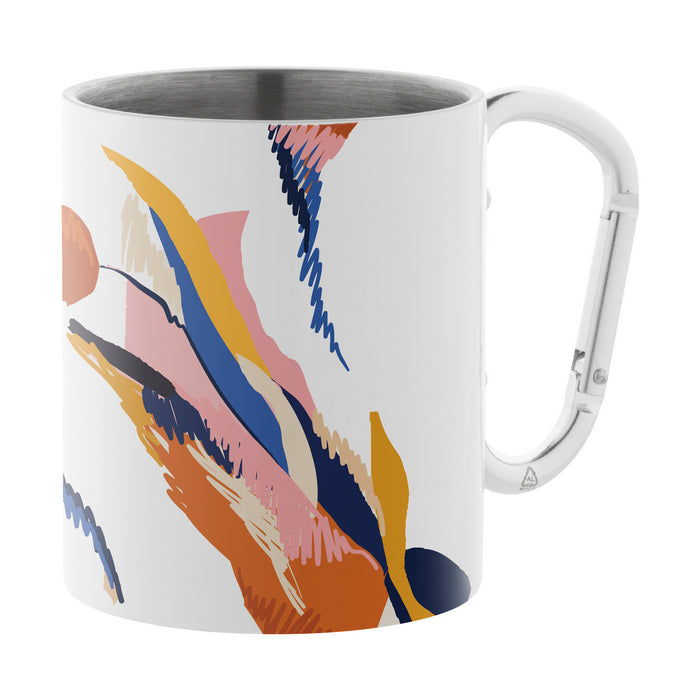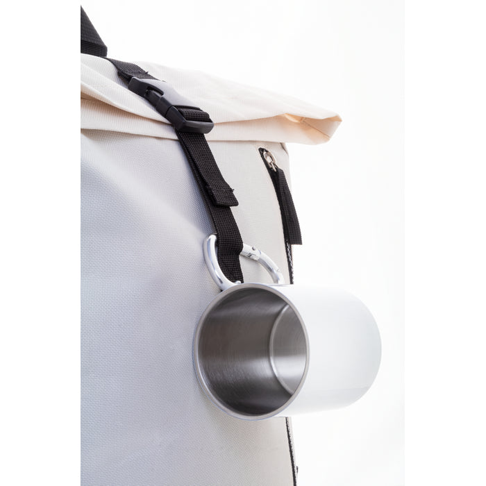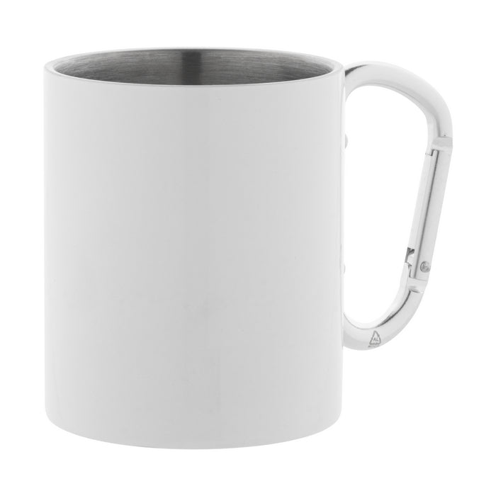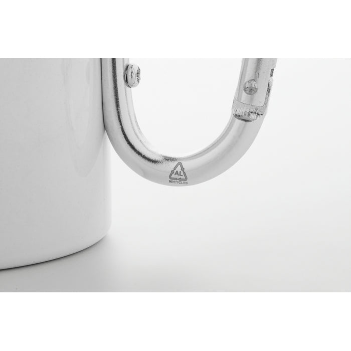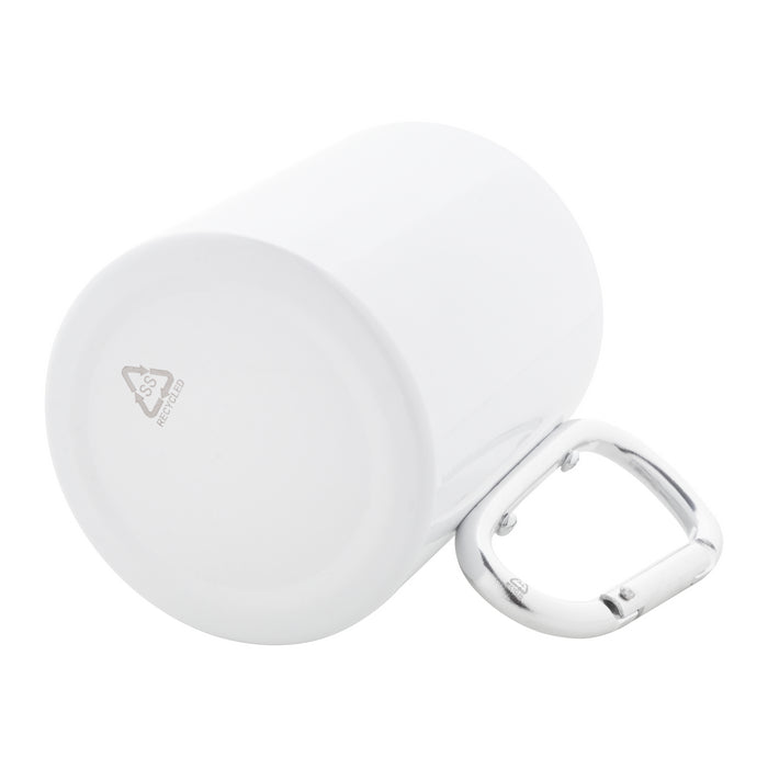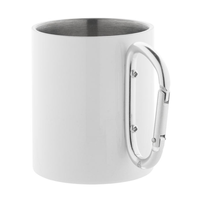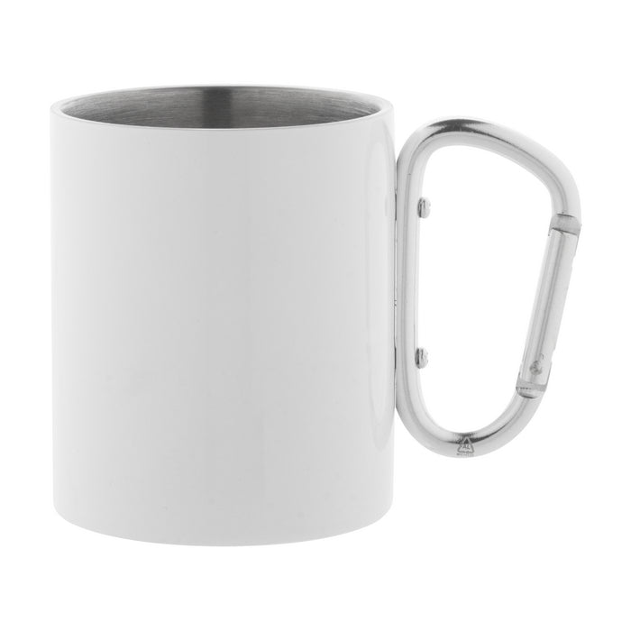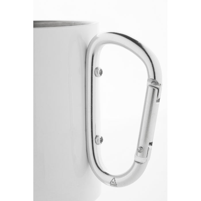 Cana termoizolanta cu perete dublu, din otel inoxidabil reciclat, pentru sublimare, cu maner carabina din aluminiu reciclat. 300 ml. in cutie de hartie kraft.