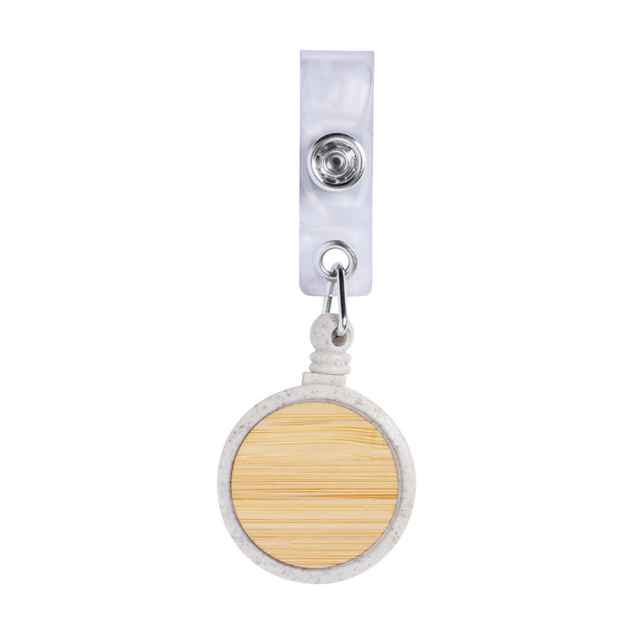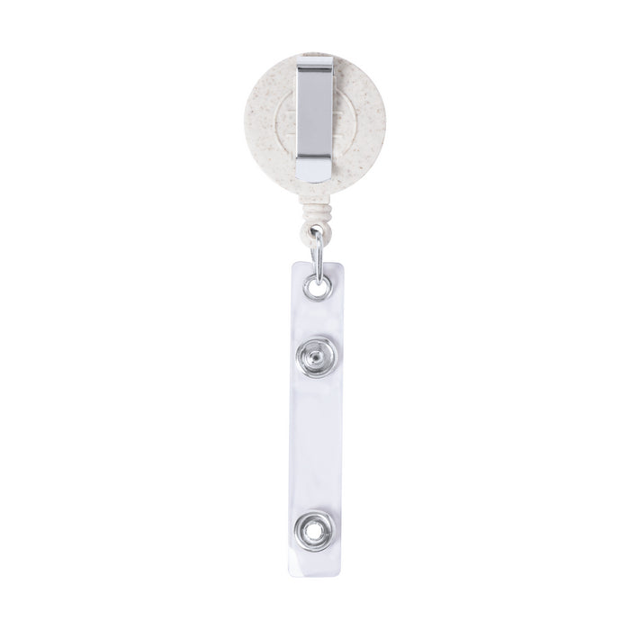 Dispozitiv retractabil pentru prindere ecuson din plastic ecologic cu paie de grau si bambus cu inchidere cu capsa, snur retractabil si clema metalica.
