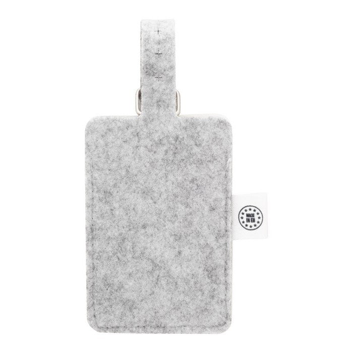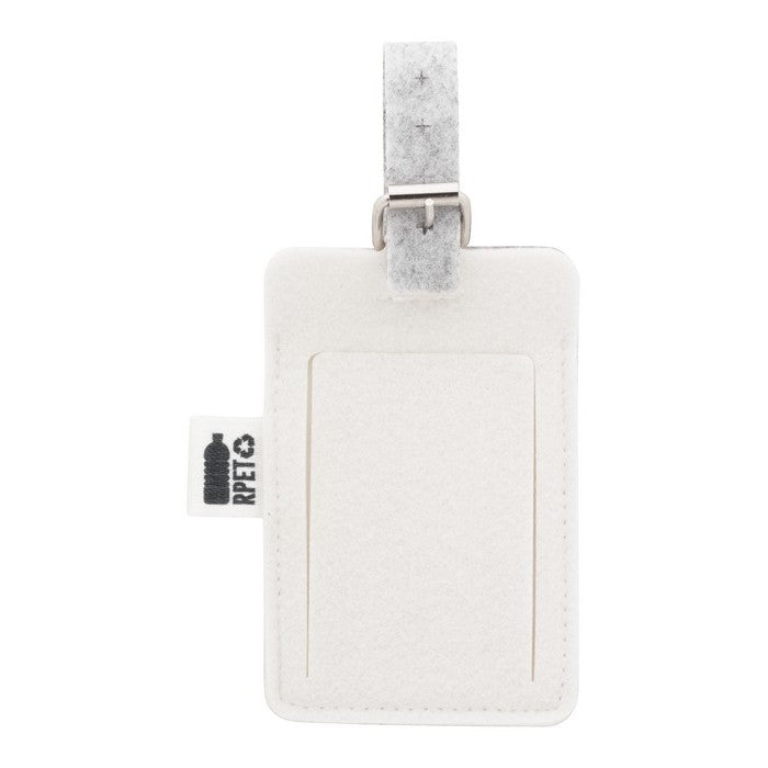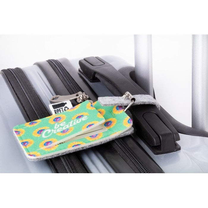Eticheta de bagaj, din pasla RPET, realizata la comanda, cu partea frontala imprimata color, inchidere cu catarama si insertie de hartie. cu eticheta distinctiva RPET. Pretul include imprimarea prin sublimare. MOQ: 50 buc., material: fetru reciclat+hartie, dimensiune: 200×65×7 mm