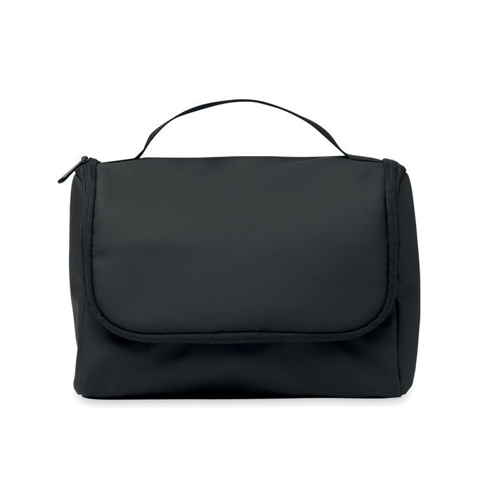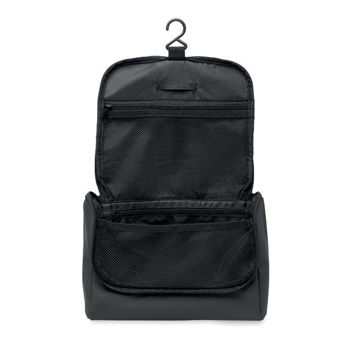 Geanta organizator cosmetica din PU moale cu carlig de agatat si captuseala 210D RPET. Un compartiment principal mare, fermoar si 1 compartiment din plasa, dimensiune: 26 x 15 x 18cm, material:pu