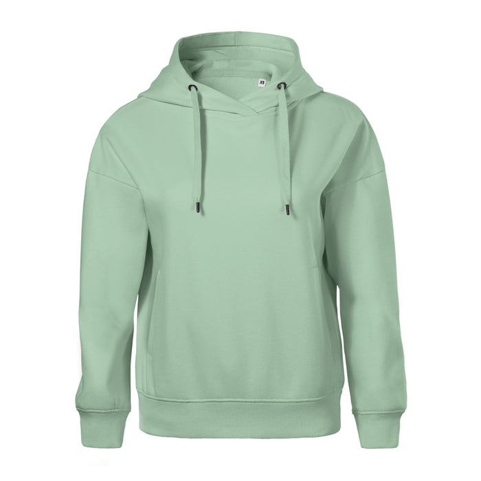 material: 280 g/mp, French terry, 80 % bumbac, 20 % poliester (compoziţia culorii 12 poate sa fie diferita – 75 % bumbac şi 25 % vascoza), interior pieptanat. Marimi S - 3XL. Fara eticheta - pregatit de rebranding, croiala lejera ce prezinta cusaturi laterale, gluga captusita, prevazuta cu snur, eticheta pentru marime, de dimensiuni mici, in partea posterioara a gulerului, interiorul gulerului prezinta banda de intarire in culoarea materialului de baza, maneci decupate, buzunare tip marsupiu cu bordura, tivul inferior si mansetele sunt din material raiat 2:2 cu 5 % elastan, interior pieptanat. Modelul corespondent barbatesc are codul 420 colored