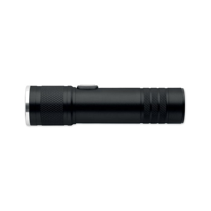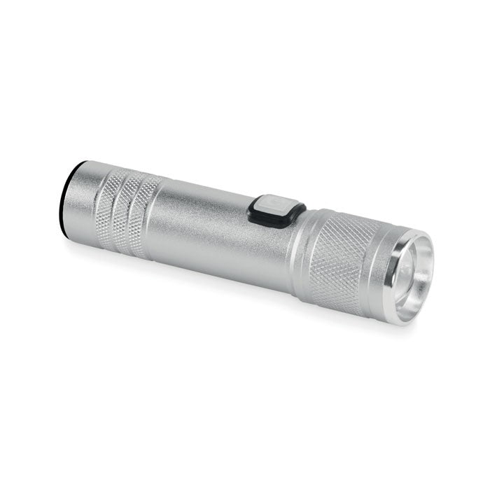 Lanterna cu lumina COB, reincarcabila si extensibila, din aluminiu reciclat, 100 lumeni cu 3 setari de lumina si functie zoom. Baterie reincarcabila incorporata de 800 mAh. Cablu de incarcare inclus, dimensiune: 2,9 x 2,9 x 11,2 cm, material: aluminiu reciclat.