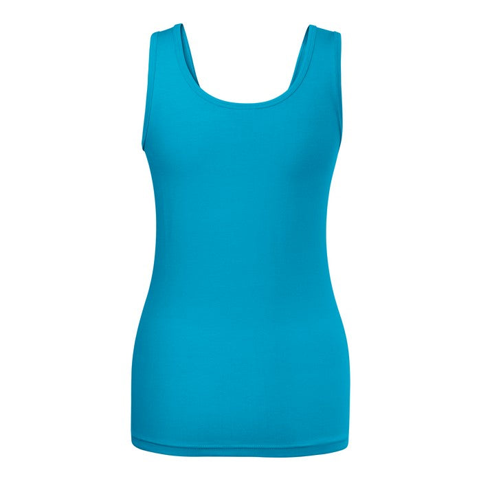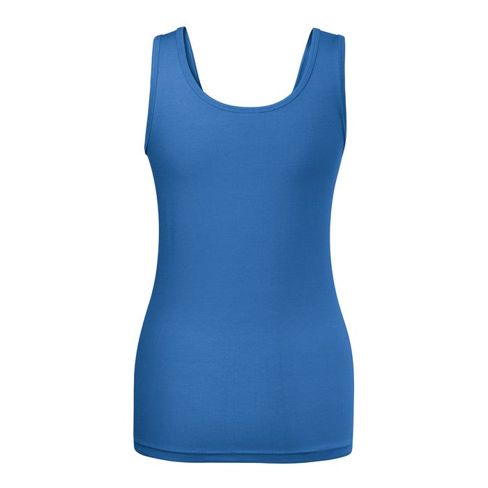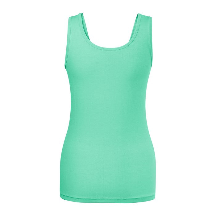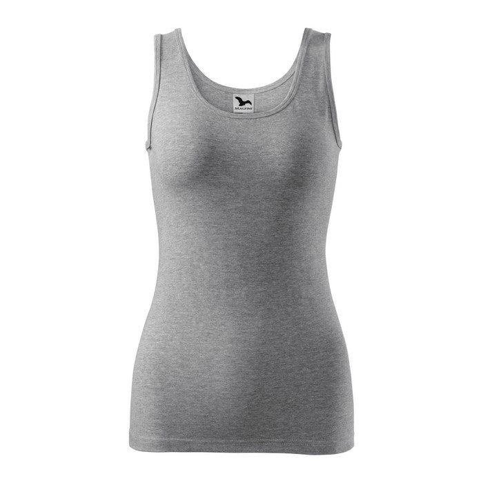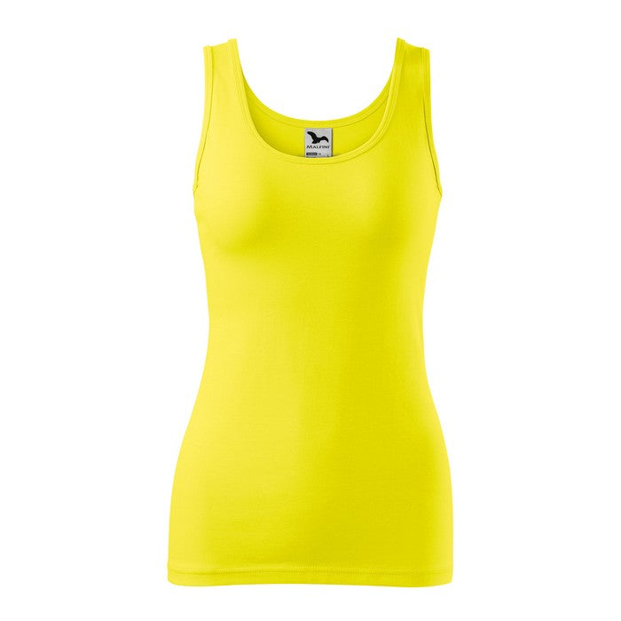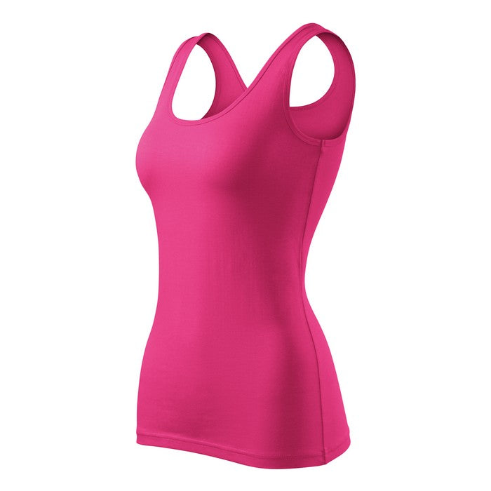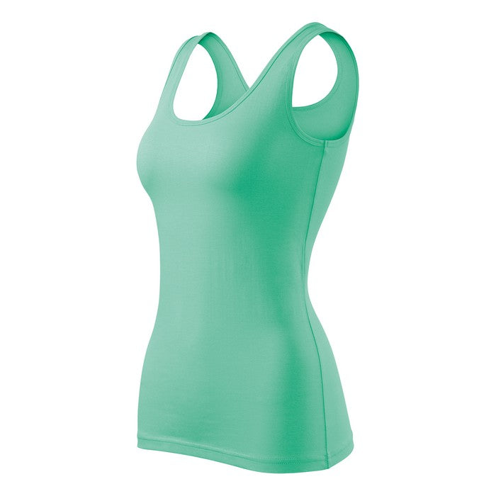 material: 180 g/mp, Single Jersey, 95 % bumbac, 5 % elastan (compozitia culorii 12 poate sa fie diferita - 80 % bumbac, 15 % viscoza, 5 % elastan). Marimi XS - 2XL. Materialul elastic confera stabilitate formei, croiala "slim fit" ce prezinta cusaturi laterale, guler rotund cu decolteu adanc, gulerul si rascroiala manecilor sunt finisate din acelasi material precum cel de baza, bretele late. Modelul corespondent barbatesc are codul 142 colored