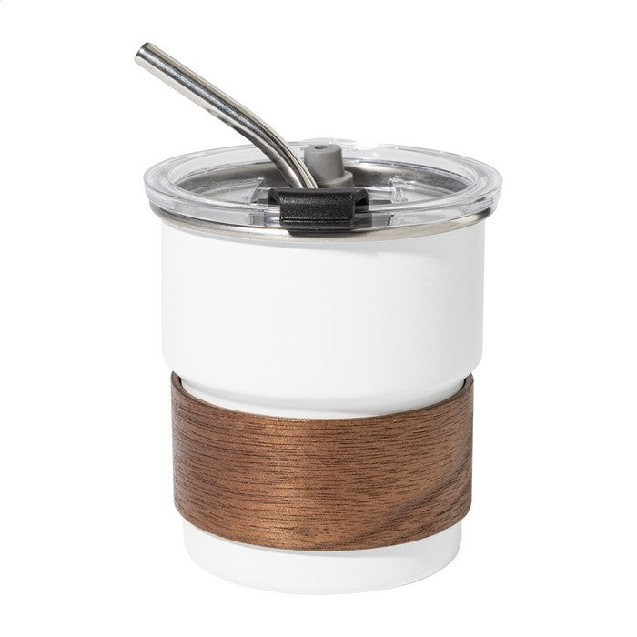 Pahar de voiaj, din otel inoxidabil reciclat, cu perete simplu, maner din lemn de nuc, capac din plastic si pai din otel inoxidabil reciclat. 260 ml., material: lemn reciclat+lemn, dimensiune: ø80×90 mm