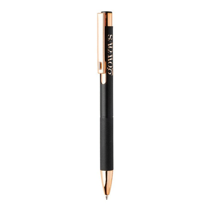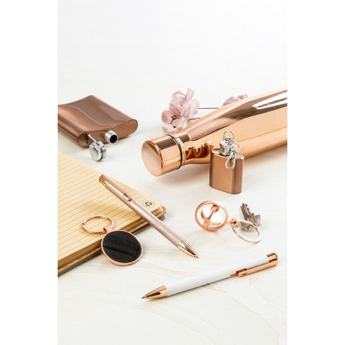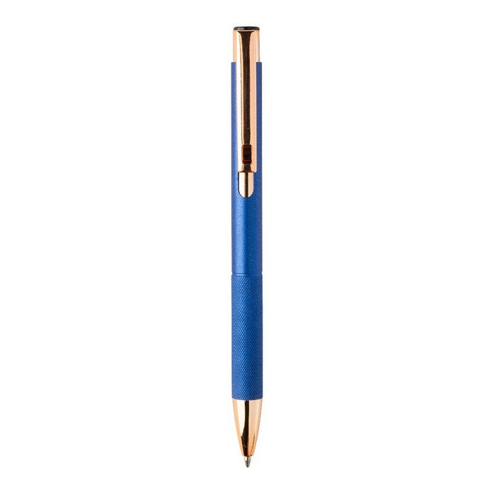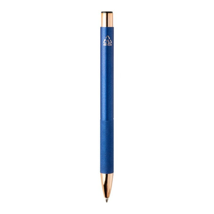 Pix din aluminiu reciclat, cu corp cu finisaj mat, grip texturat si detalii auriu-roz. cu strat special pentru gravare laser in oglinda, de culoare auriu-roz. cu mina albastra., material: aluminiu reciclat, dimensiune: ø10×137 mm