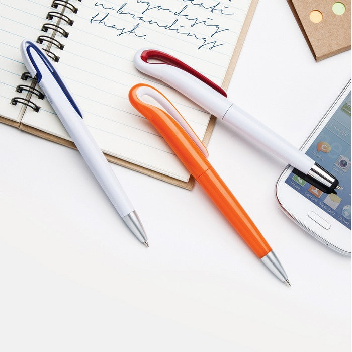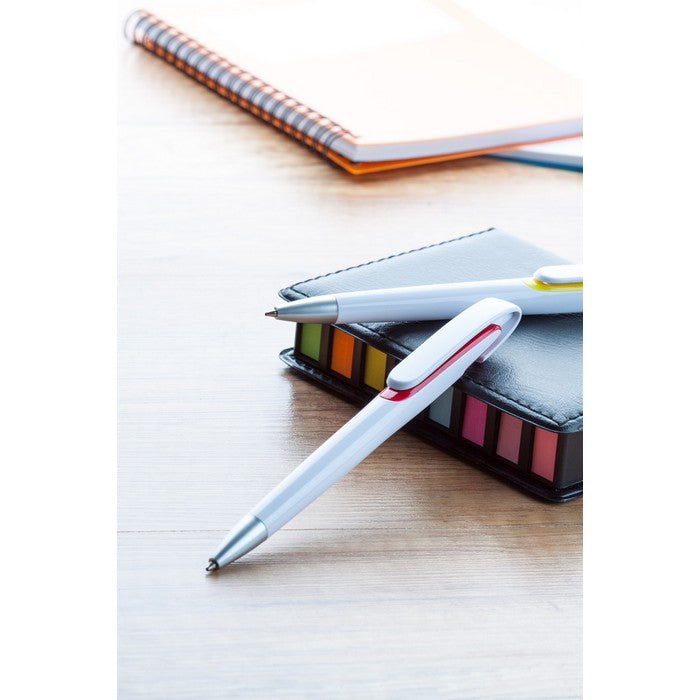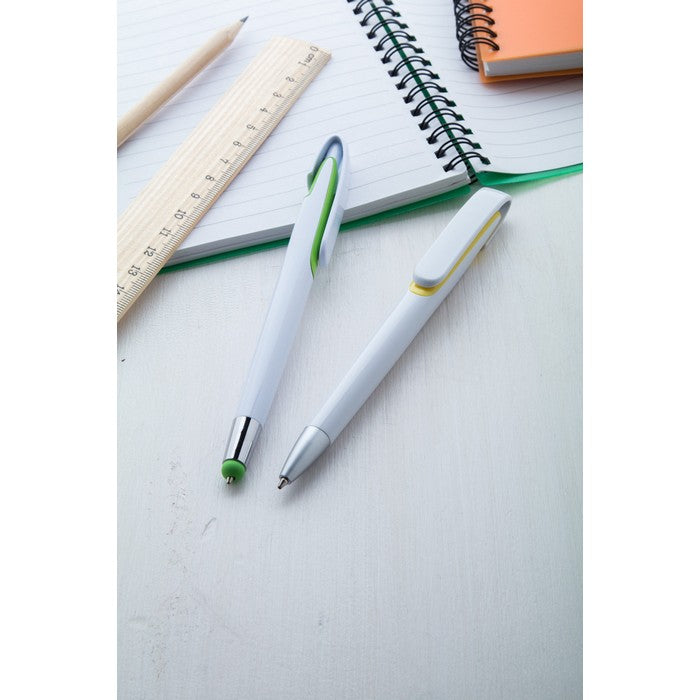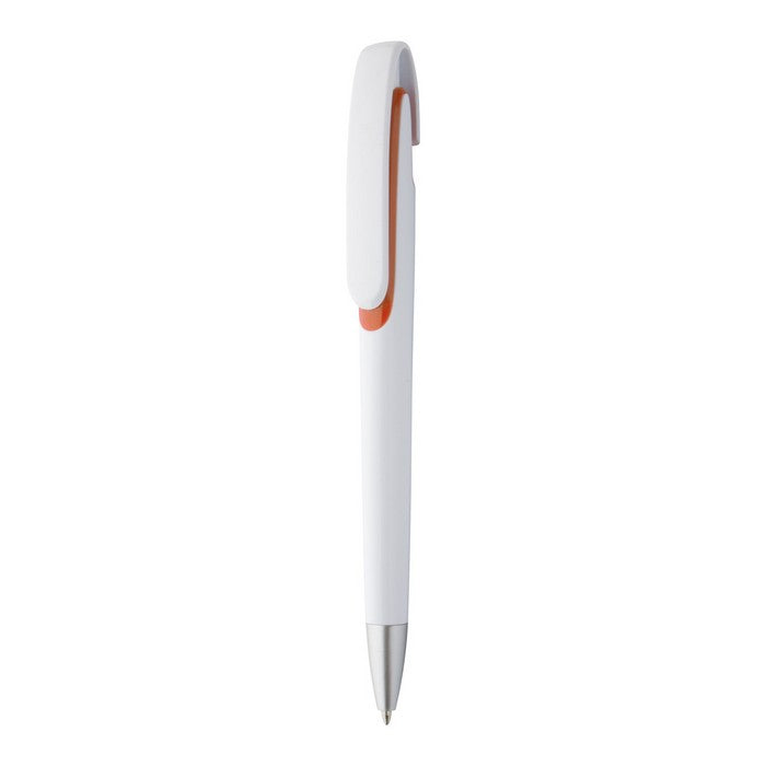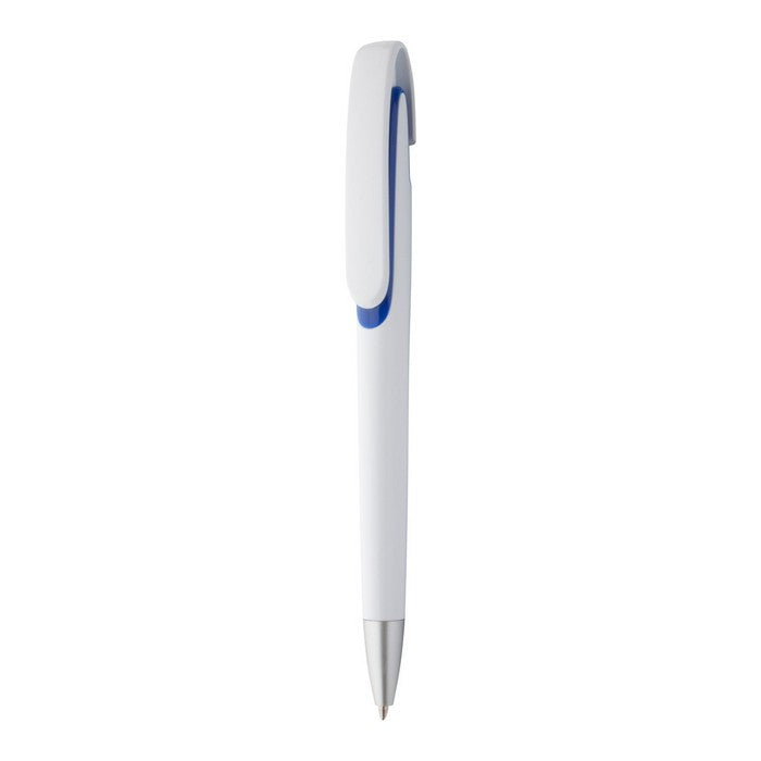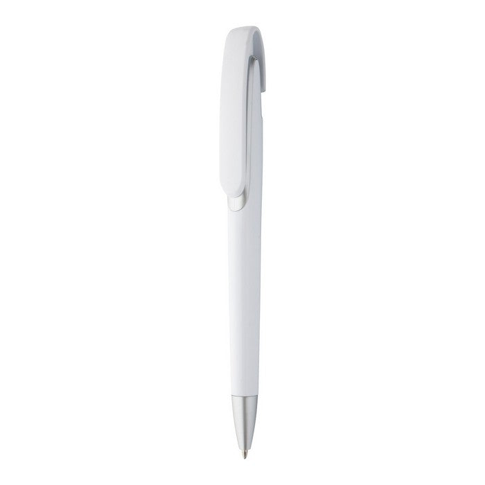 Pix din plastic, corp alb, varf argintiu. Mina albastra. Dimensiune: ø11 × 150 mm