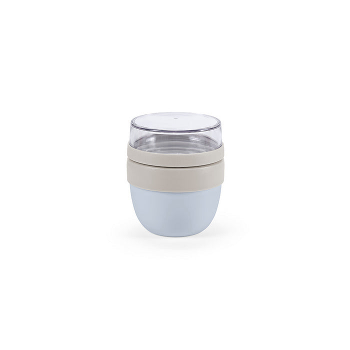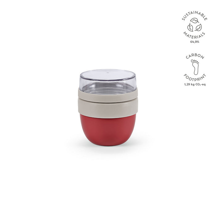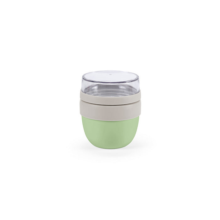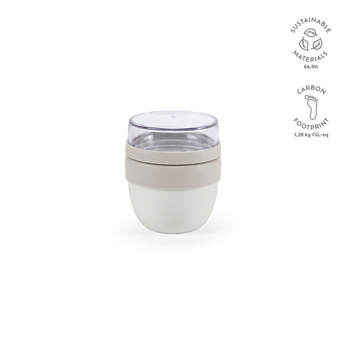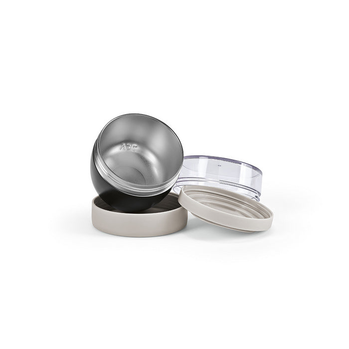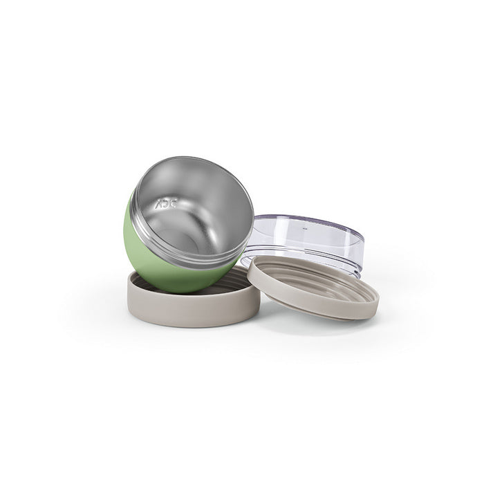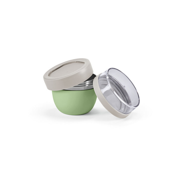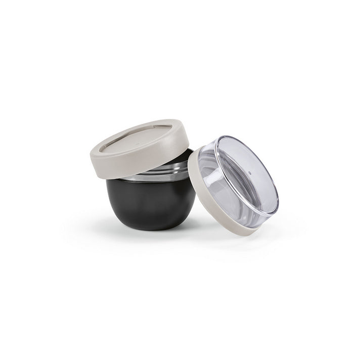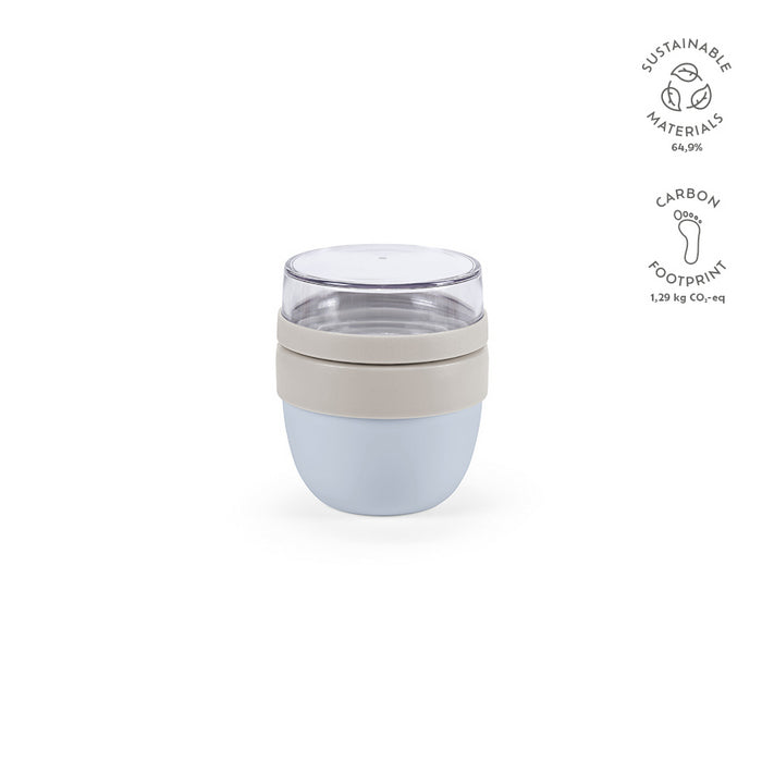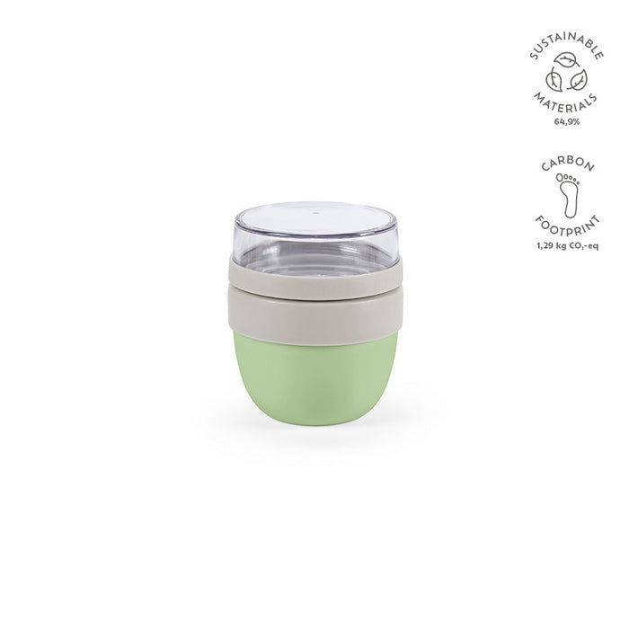 Recipient alimente cu 2 compartimente: partea inferioara de 350 ml (260 ml net) de otel inoxidabil reciclat si partea superioara de 230 ml (110 ml net) din plastic transparent. Cu pereti dubli, forma ovala, cu capac rezistent la scurgeri.