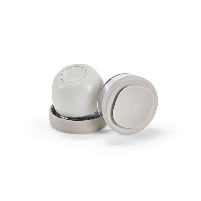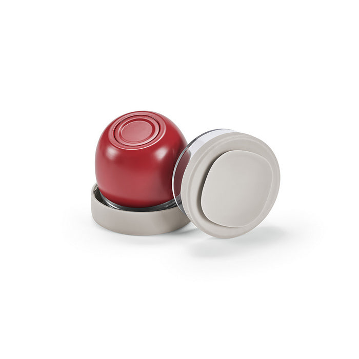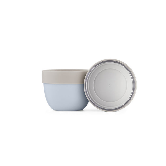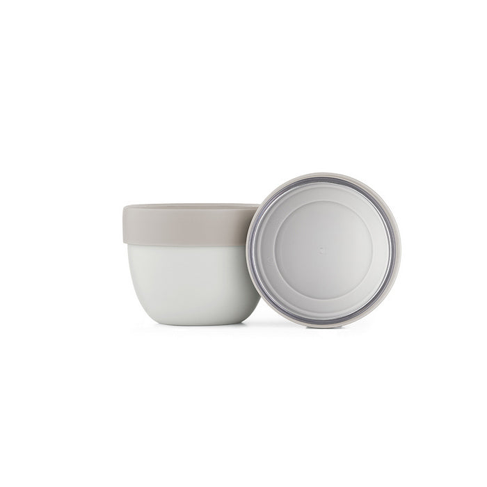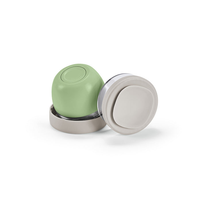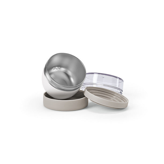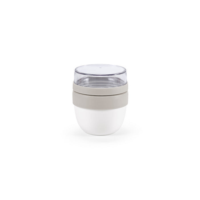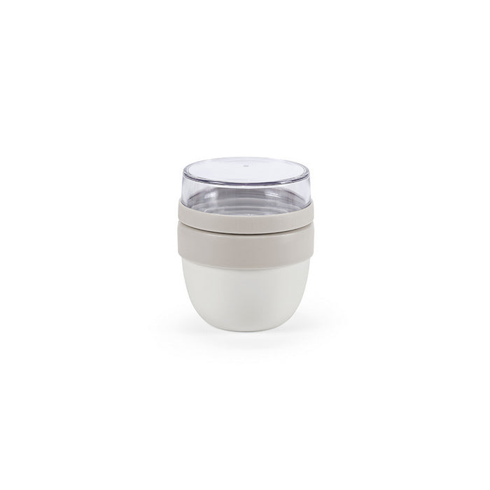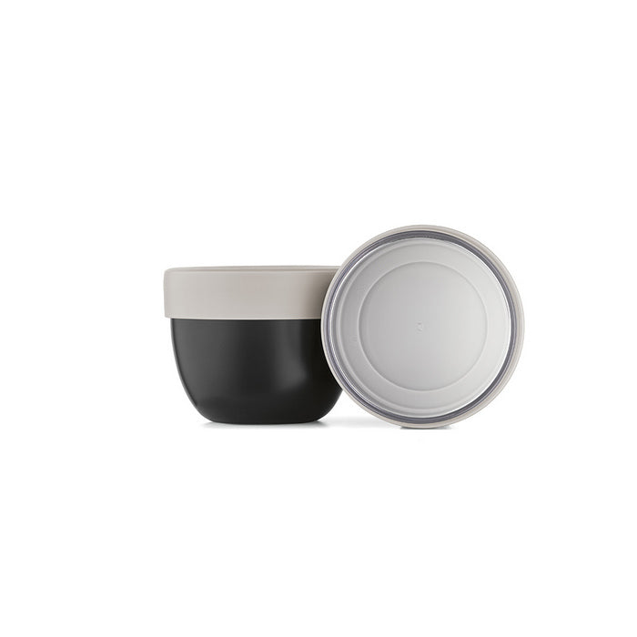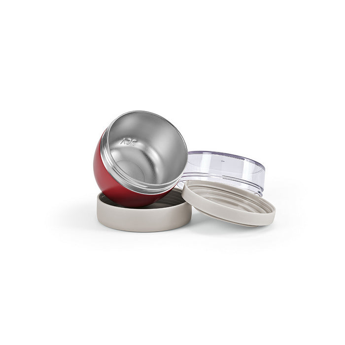 Recipient alimente cu 2 compartimente: partea inferioara de 350 ml (260 ml net) de otel inoxidabil reciclat si partea superioara de 230 ml (110 ml net) din plastic transparent. Cu pereti dubli, forma ovala, cu capac rezistent la scurgeri.