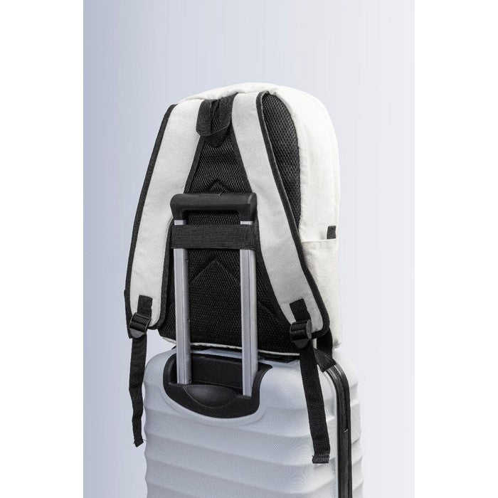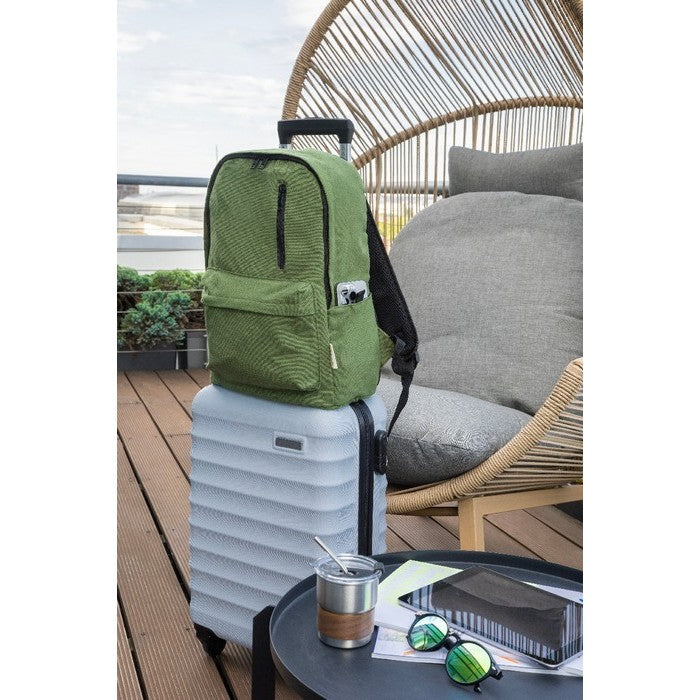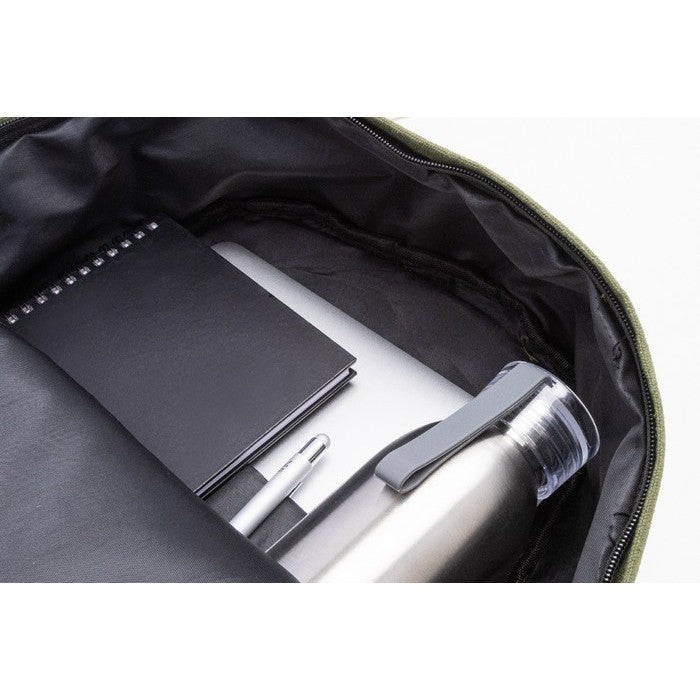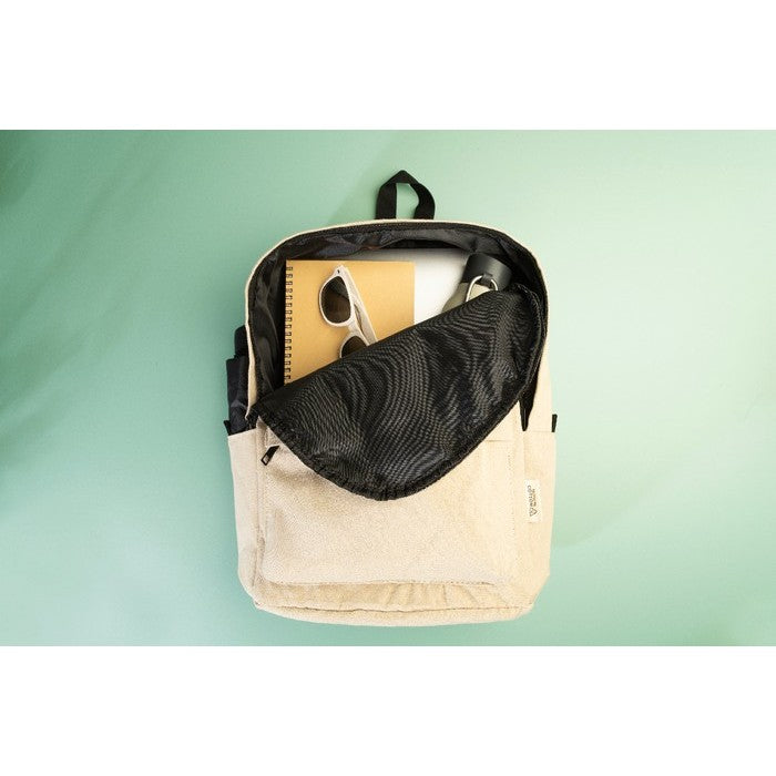 Rucsac din panza reciclata, cu compartiment principal cu fermoar, compartiment captusit pentru laptop (15"), 2 buzunare frontale cu fermoar, buzunare laterale, curea pentru troler, bretele captusite pentru spate si umar. 70% bumbac reciclat si 30% poliester RPET. cu eticheta distinctiva din bumbac reciclat., material: bumbac reciclat+poliester reciclat, dimensiune: 320×440×170 mm