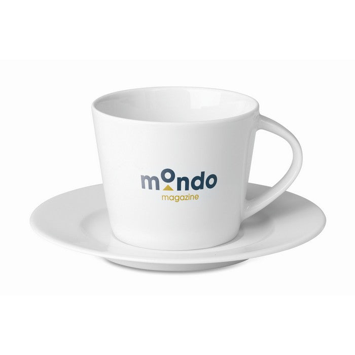 Cana conica din portelan pentru cappuccino cu farfurioara. Capacitate cana: 180 ml. Ambalare vrac. Tampografia nu rezista la masina de spalat vase. Transferul ceramic rezista la masina de spalat vase. Material: Ceramica. Dimensiune: Ø14,7 x 7 cm