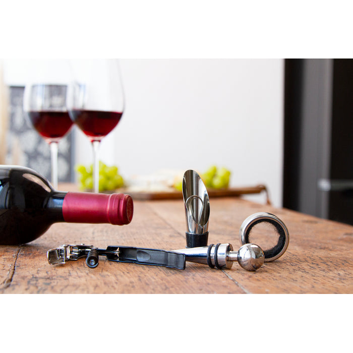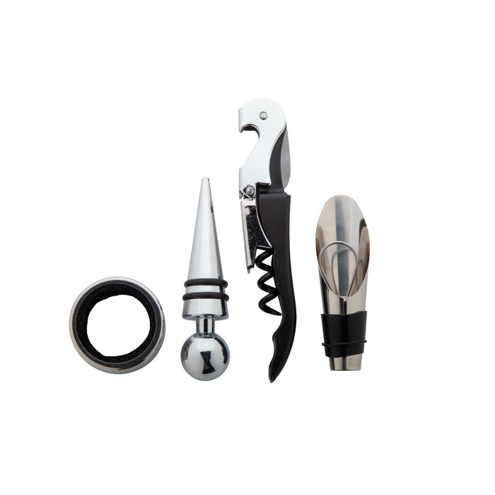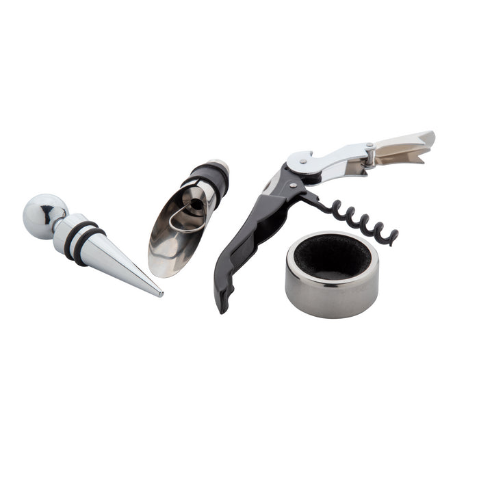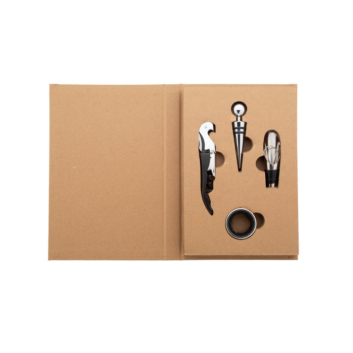 Set pentru vin din otel inoxidabil cu 4 piese in caseta din hartie reciclata Kraft. Include tirbuson, inel antipicurare, duza pentru turnare si dop.