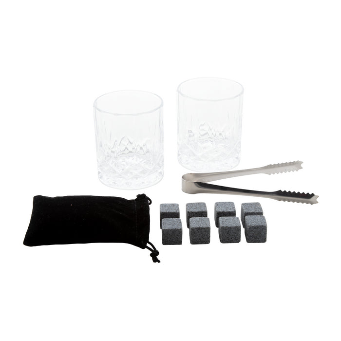 Set de lux pentru whisky in cutie cadou din bambus. Include 2 pahare de whisky (250 ml), 8 cuburi de gheata din piatra reutilizabile, cu husa de depozitare si cleste din otel inoxidabil.