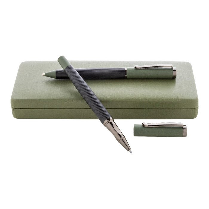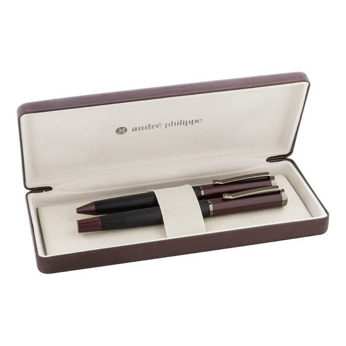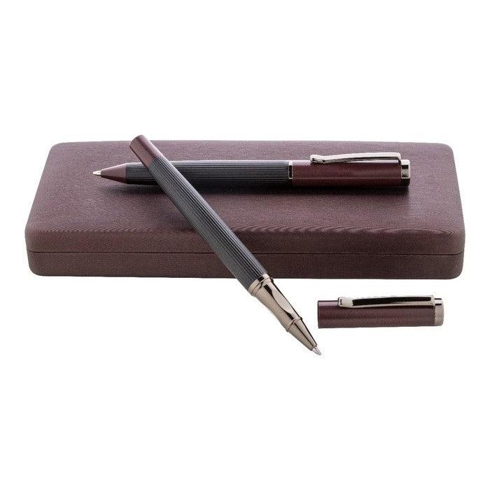 Set elegant de pix si roller, din metal, cu bara in dungi, accente colorate si detalii metalice stralucitoare. in Cutie cadou de culoare asortata, cu mina albastra. Produs marca André Philippe., material: lemn, dimensiune: 185×80×27 mm