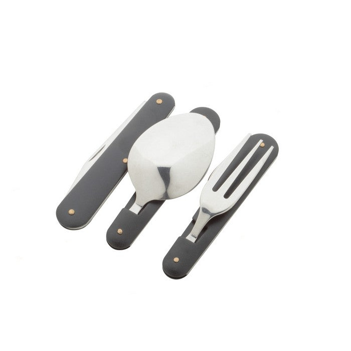 Tacamuri pliabile de camping din otel inoxidabil cu manere din aluminiu. Include: furculita, cutit si lingura. In geanta de transport neagra. Dimensiune: 110 × 70 × 20 mm