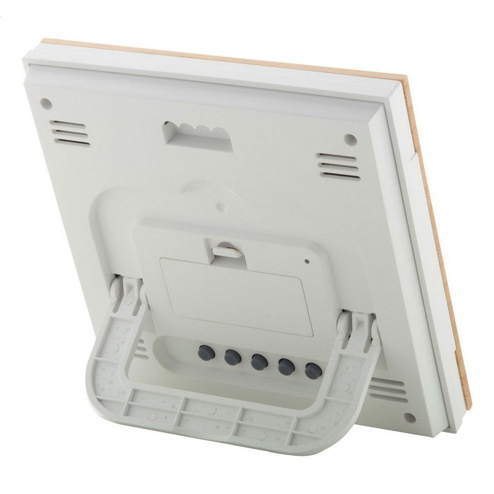 Statie meteo si ceas digital cu panou frontal din bambus. Functii: ceas cu alarma, calendar, termometru, afisare umiditate si memorie trend de temperatura. Functioneaza cu 2 baterii AAA (fara baterie). Dimensiune: 130 × 130 × 23 mm